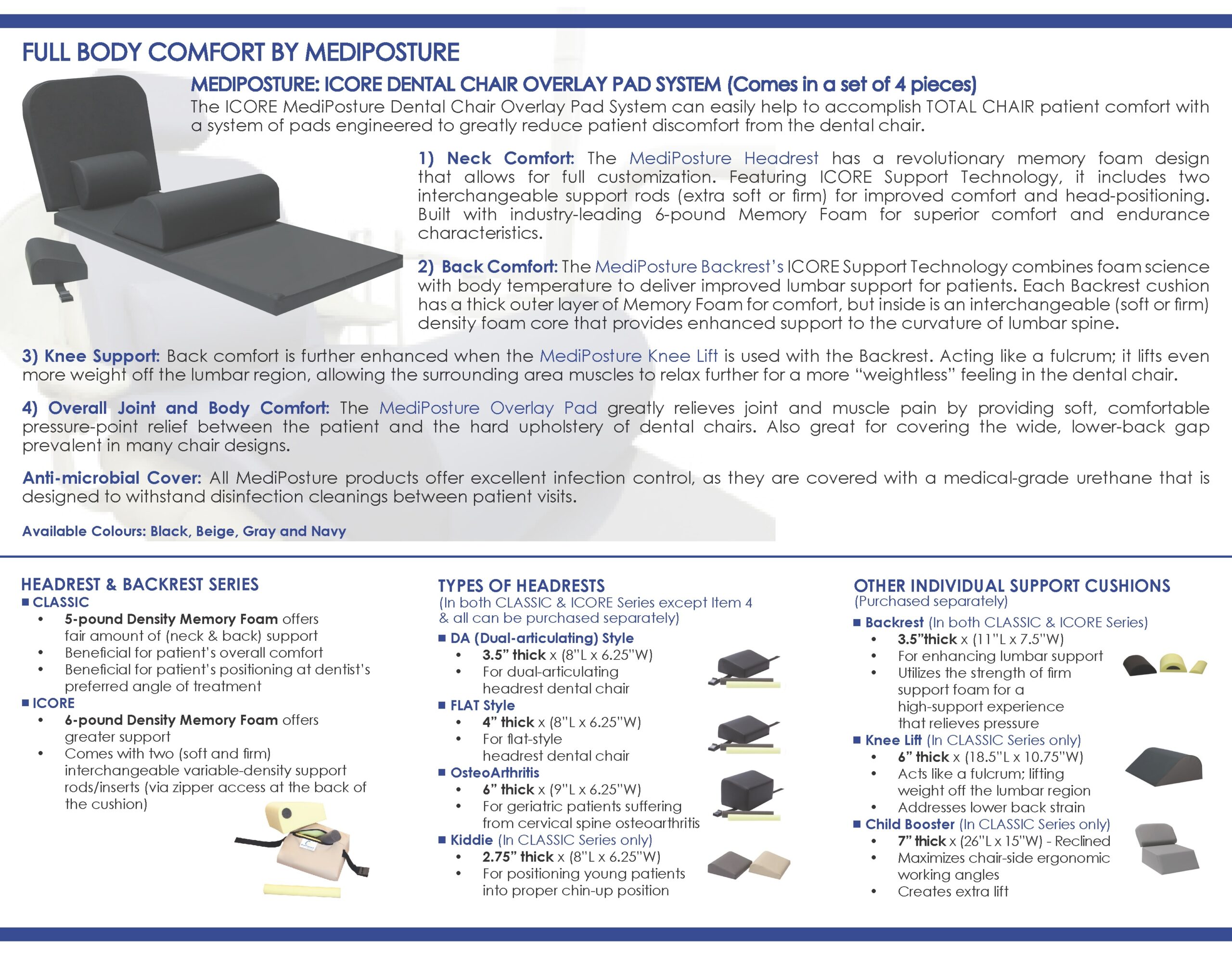 MEDIPOSTURE DENTAL CHAIR OVERLAY CUSHIONS LET YOUR BODY FEEL THE SOFT AND RELAXING COMFORT OF BEING ON THE DENTAL CHAIR, BY EXPERIENCING:-